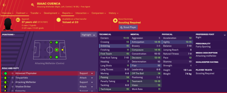 Ako ste slabi na klasične plejmejkere na poziciji ‚‚desetke”, onda je Kuenka vaše rešenje. Tehnički je odličan, a fizički i ne toliko, tako da pokušajte da vaš tim gradite oko njega i videćete da koliko kreativan ume da bude.