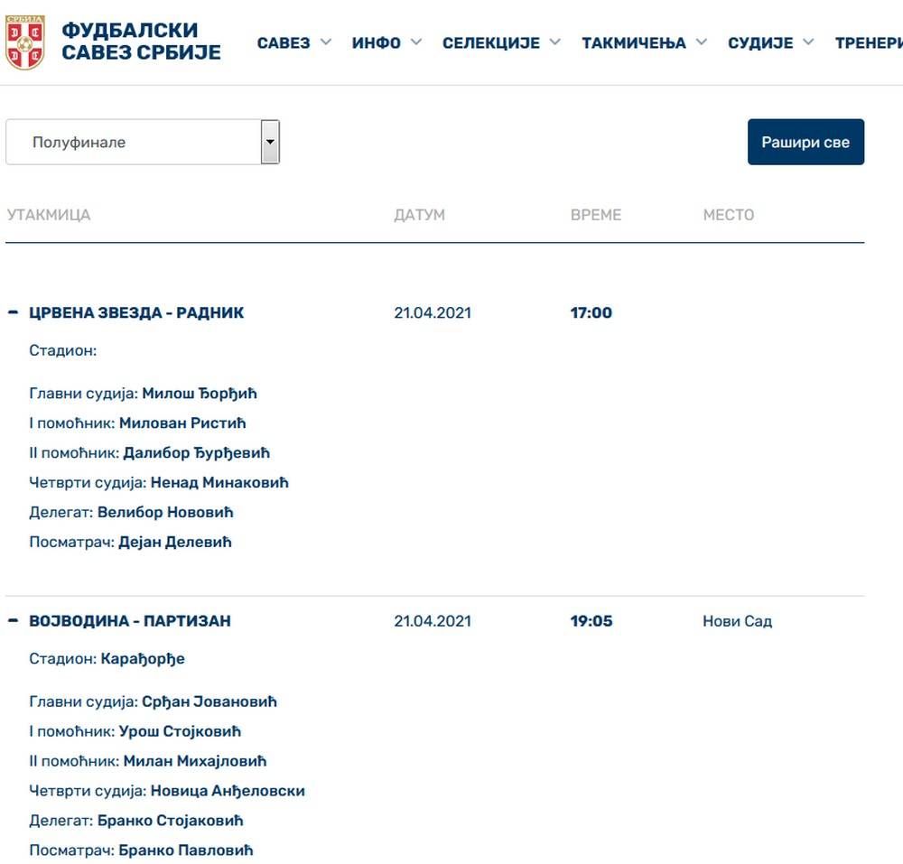 Utakmice će biti odigrane u Beogradu i Novom Sadu, a poznati su i sudijski timovi. Glavni arbitar u okršaju Zvezde i Radnika na stadionu “Rajko Mitić” biće Miloš Đorđić, a pomagaće mu Milovan Ristić i Dalibor Đurđević.