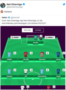 Iako je odbranio dva penala u prva dva kola Premijer lige, Nil Eteridž očito nema visoko mišljenje o sebi i svojim golmanskim potencijalima. Dovoljno je da pogledate njegov tim u Fantaziju, i sve će vam biti jasno. U startnoj postavi, Eteridžov golman je David de Hea, umesto njega samog. Da paradoks bude veći, golman Kardiva je bio junak drugog kola. Reprezentativac Filipina je u nadoknadi vremena doneo bod svojoj ekipi, ali je ostao kraći za 16 poena u ovoj igri.