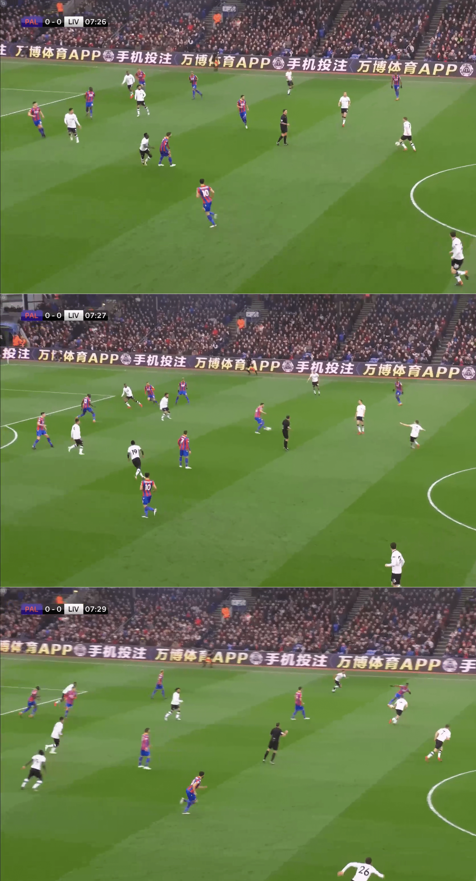 Na srednjem delu slike Milner odigrava pas ka Salahu, ali je Milivojević i ovog puta na pravom mestu i uspeva da preseče pas, a na poslednjem trećem delu se vidi kako lopta stiže do Zahe i time otpočinje napad Palasa.