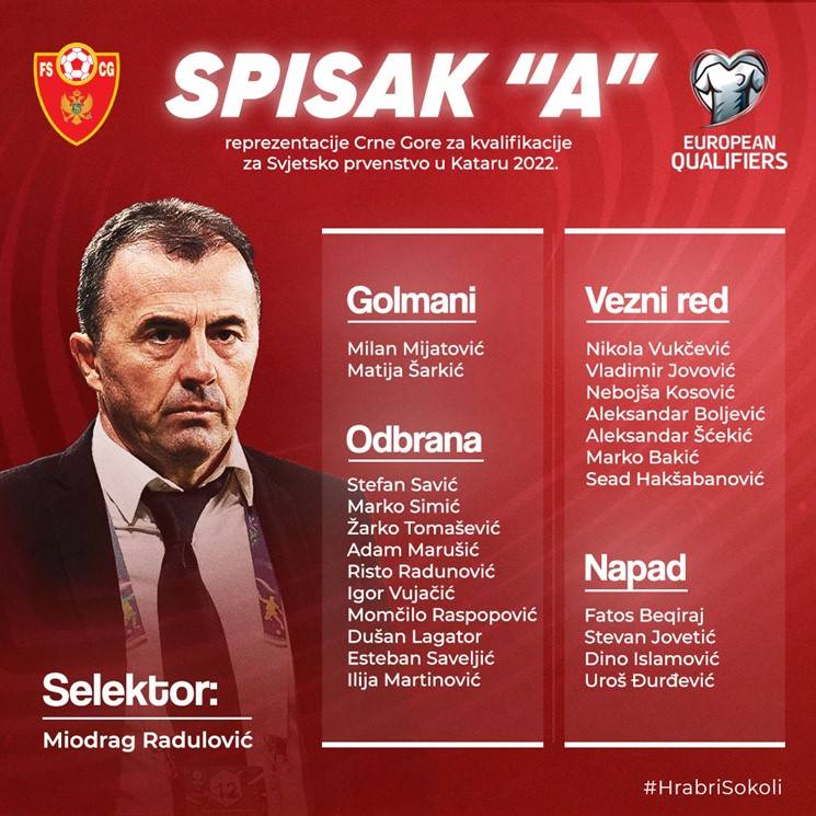 “Hrabri sokoli” će prvu utakmicu kvalifikacija za Mondijal u Kataru igrati u gostima sa Letonijom (24. mart), zatim će u Podgoricu doći Gibraltar (27. mart) i Norveška (30. mart).