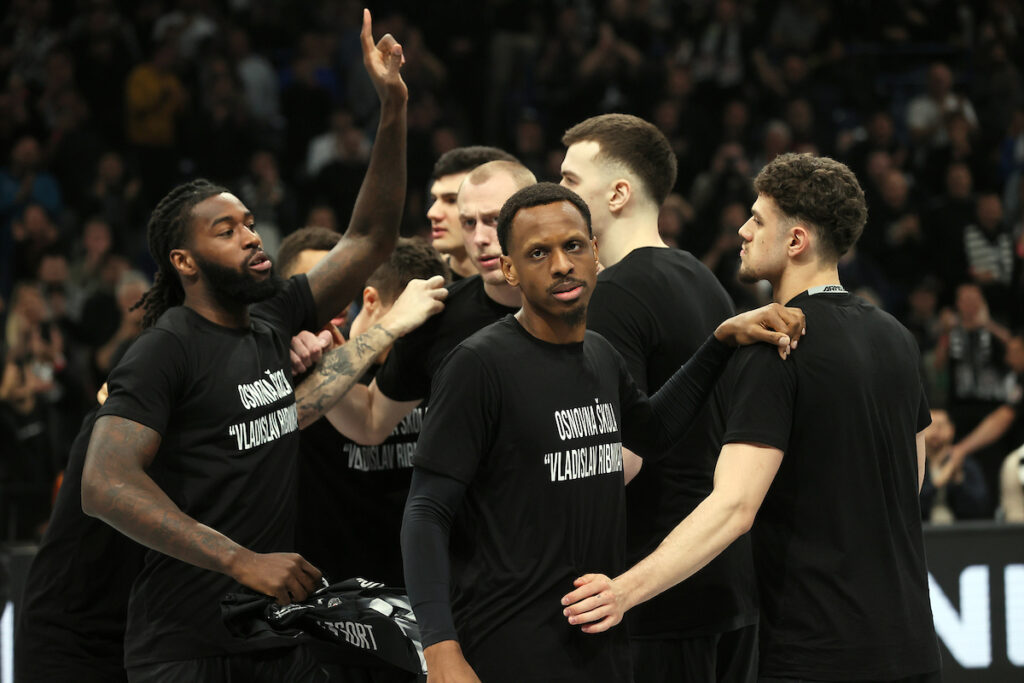 Košarkaši Partizana igrali su u crnim dresovima, a na grudima je bilo ispisano ime škole “Vladislav Ribnikar”.