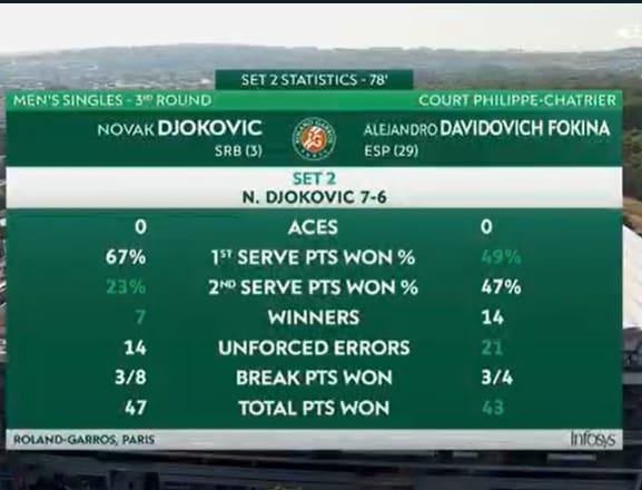 - 5:5 – Fokina servira za opstanak u prvom setu, stigao je do vođstva 30:15, zatim i do 40:30, ali je Srbin stigao do izjednačenja. Nakon toga usledili su dobri servisi za španskog tenisera i uspeo je da dođe do poravnanja.